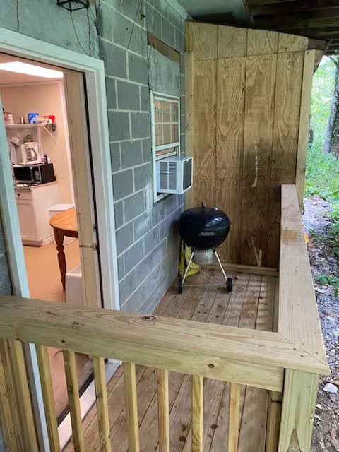 Large studio apartment for rent in Boone, NC, offering convenient off-campus student housing near Appalachian State University. This studio is located in a quiet, wooded setting and includes electricity, water/sewer, trash, and parking in the rent. Ideal for App State students, the property is just a short walk to AppalCART for easy transportation to campus and downtown Boone.